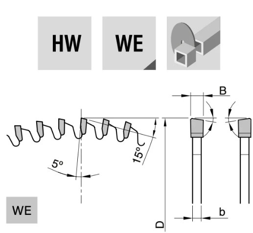 Technical information: With alternate top bevel with chanfer grinded carbide teeth (HW). With negative hook angle for cutting from above. Reduced cutting width and body thickness to reduce the cutting pressure.